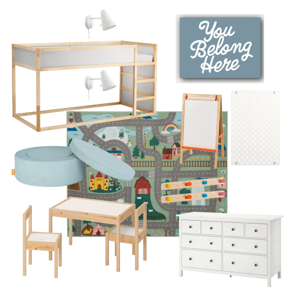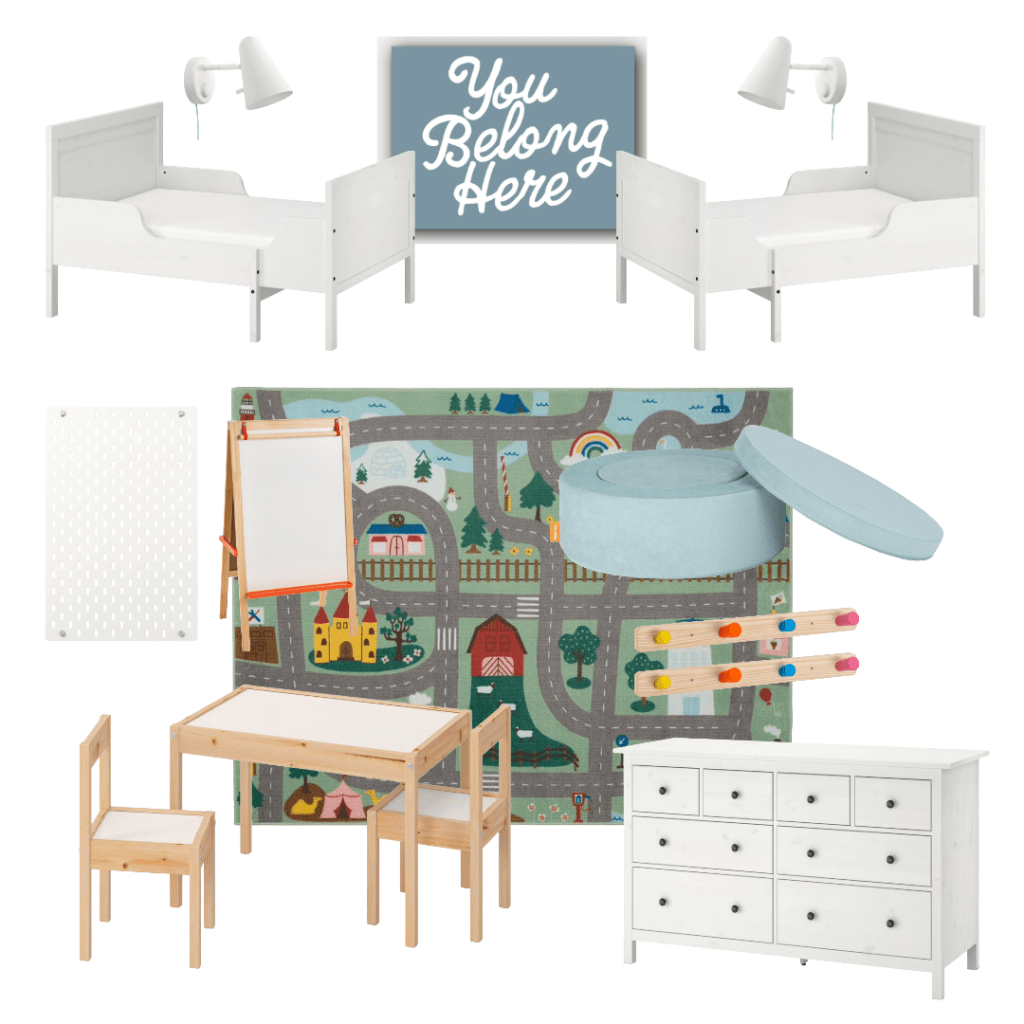 I love this layout, and it’s currently my top pick for our kids’ room layout. This reversible bed from IKEA gives us the opportunity to get wildly creative by adding a second mattress on the floor (on top of a box spring) and create a true two-bed scenario that takes up less space WHILE allowing us to keep the room in a single child scenario if we only have one in the house.