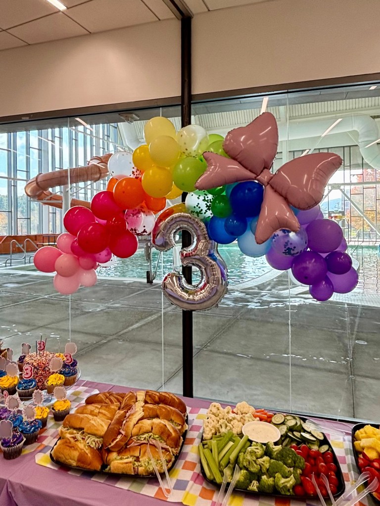 Our party timing was limited. We only had the room for an hour before two hours in the pool which meant the simpler the set up, the better. But I’m a party planner at heart and I needed the space to feel celebration worthy! One balloon was not enough.